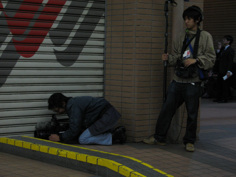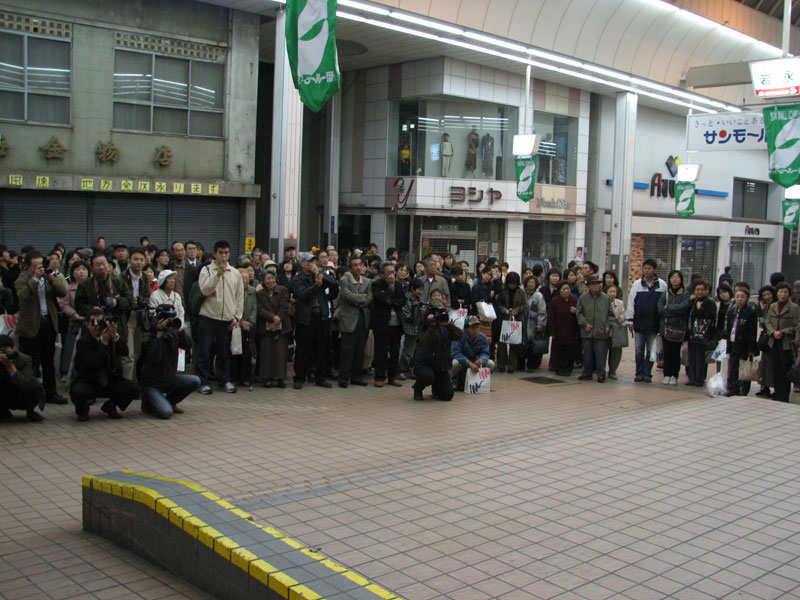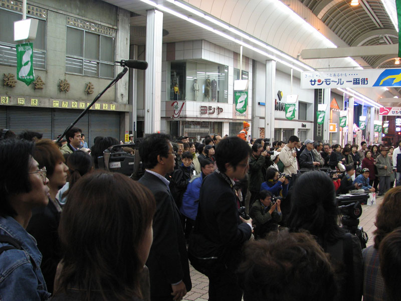 外に出ると、住民、報道陣、既にたくさんの人が店の前に集まっていた。