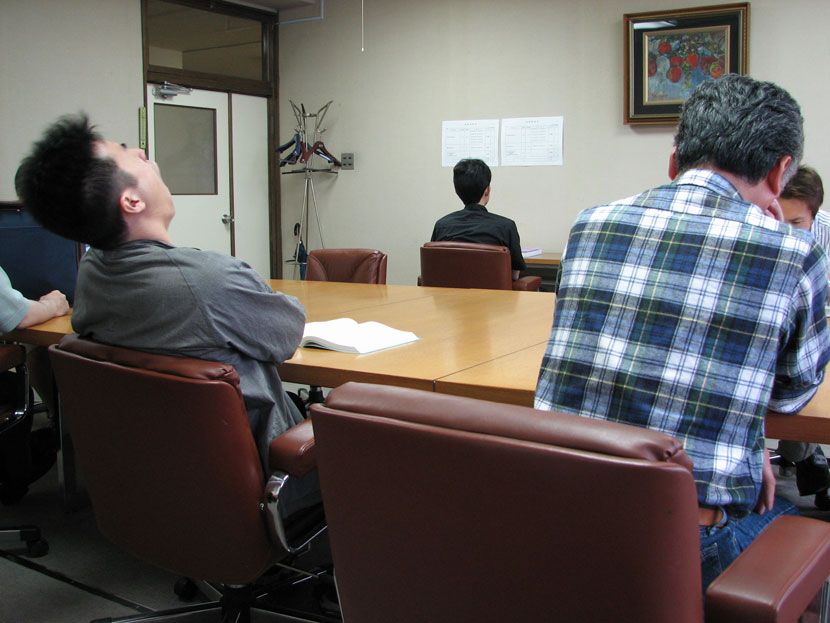 控え室では、先に退出した人たちが、一心不乱(?)に問題演習に取り組んでいる。
