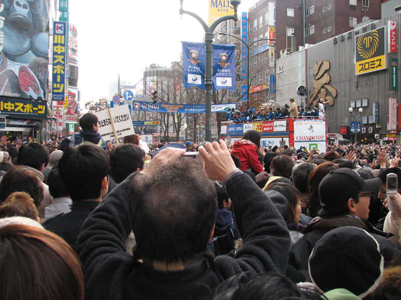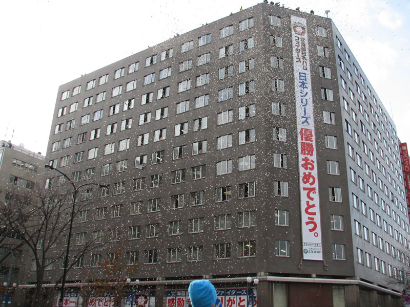 ビルの上から一斉に舞い散る紙吹雪。そして壁には「優勝おめでとう」の垂れ幕が。