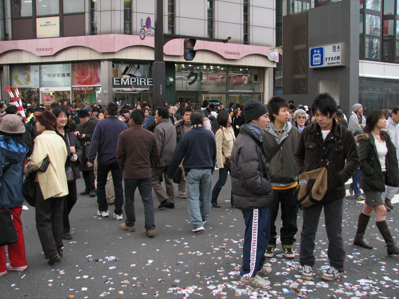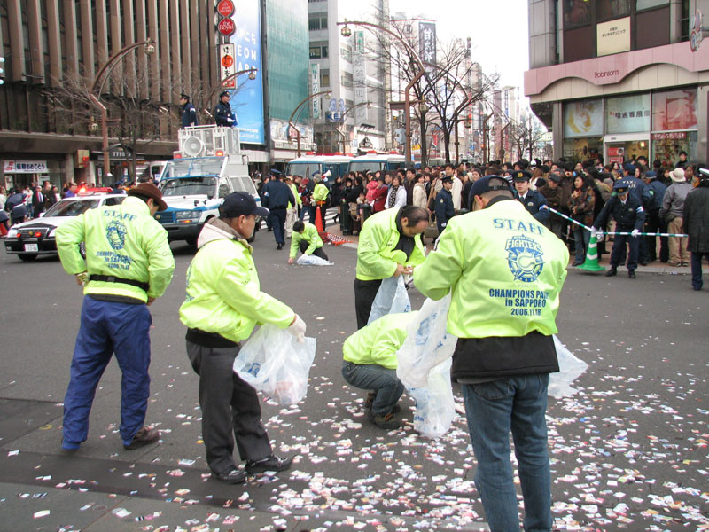 紙吹雪を片付けるスタッフの方。スタッフ以外にも自主的に紙吹雪撤去に協力する人も多かった。