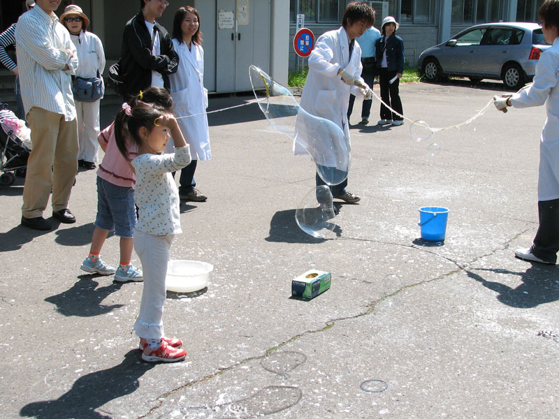 校舎前ではシャボン玉の実験を行っていた。