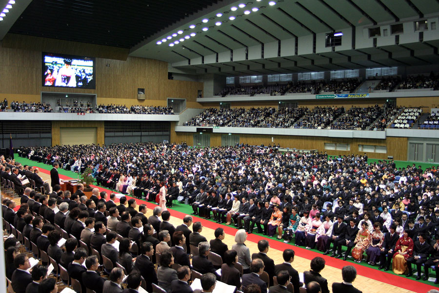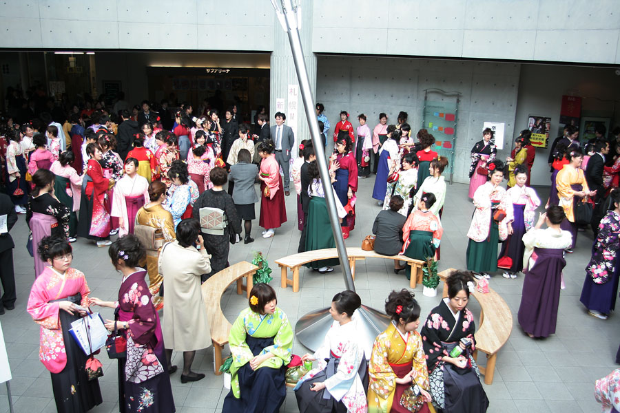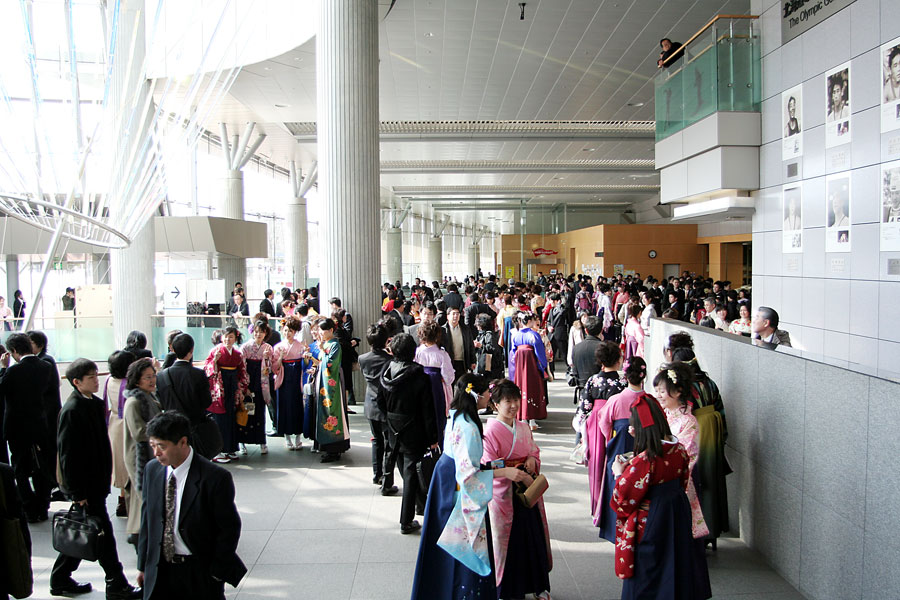 会場は毎度おなじみのきたえーる。式場にはスーツの男子学生と晴れ着の女子学生がいっぱい。