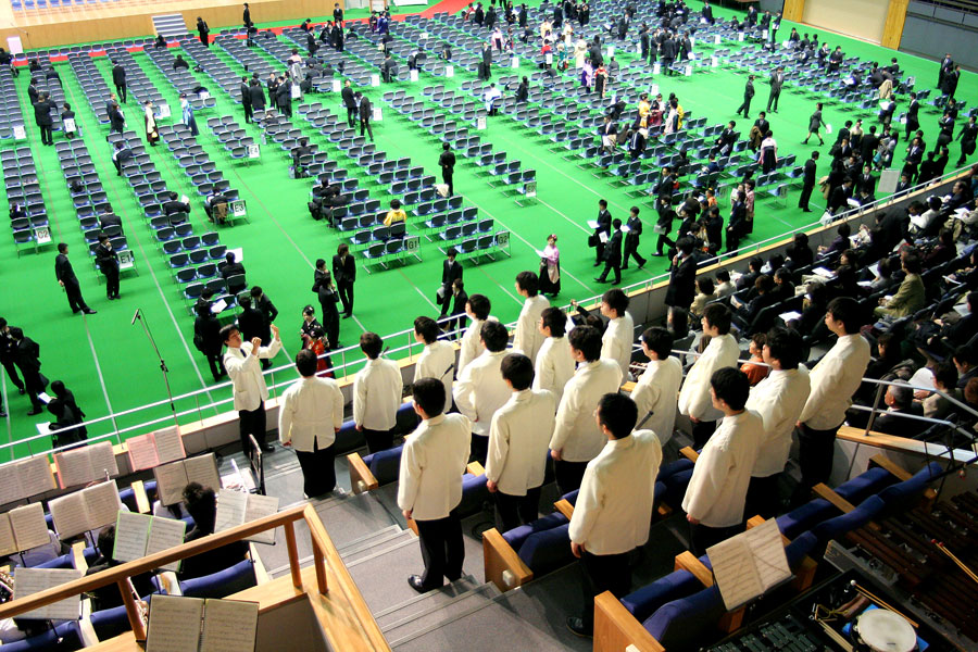式典があと少しで開始するので、式場内に入る。手前はグリークラブ。