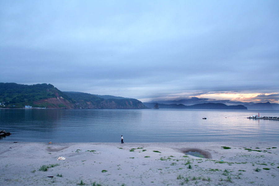 塩谷海岸。美しい湾になっている。ちょうど夕日の時刻だ。