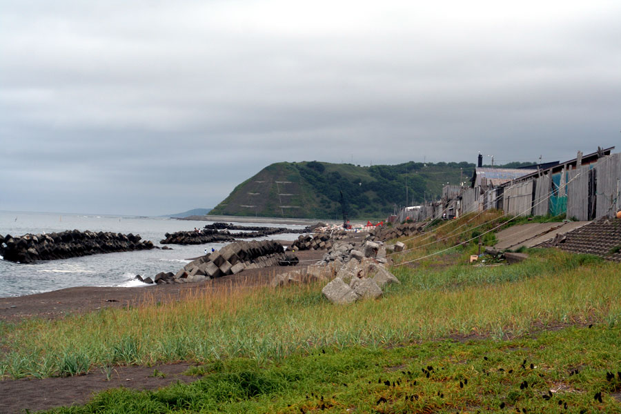 海と町との間にはこのような木の板が設けられ、風雪を防ぐ試みがされている。