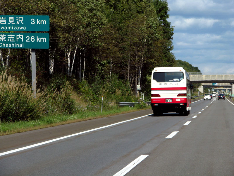 岩見沢I.C付近の下り坂、やっとターゲットのバスを捕捉。だいたい計算どおりだな。